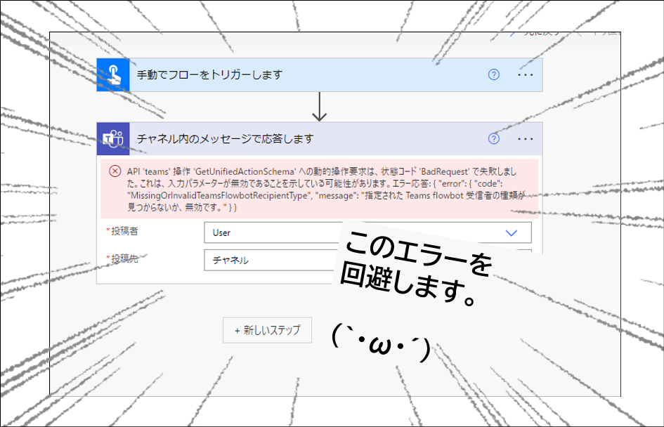 API 'teams' 操作 'GetUnifiedActionSchema' への動的操作要求は、状態コード 'BadRequest' で失敗しました。これは、入力パラメーターが無効であることを示している可能性があります。エラー応答: { "error": { "code": "MissingOrInvalidTeamsFlowbotRecipientType", "message": "指定された Teams flowbot 受信者の種類が見つからないか、無効です。" } }