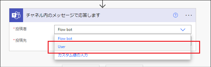botではなくユーザーとして返信を行います。そのため、「投稿者」欄で"User"を選びます。