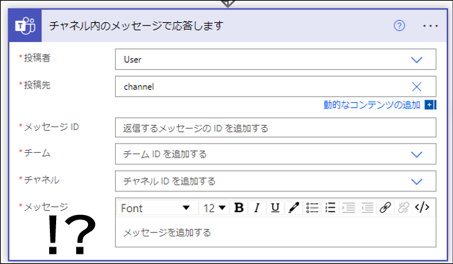 この「チャットまたはチャネルでメッセージを投稿する 」アクションに代わるものが「チャネル内のメッセージで応答します」アクションです。新しいアクションであるために機能として不十分な状態がまだ残っている状況なのかもしれません。