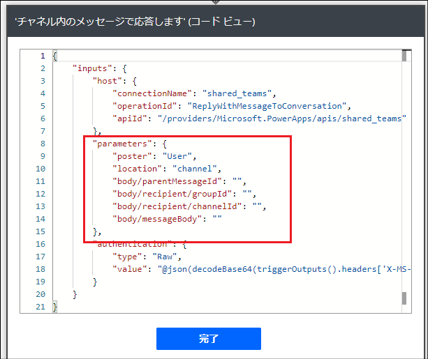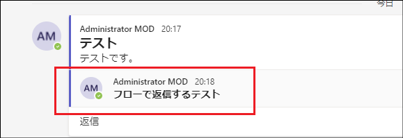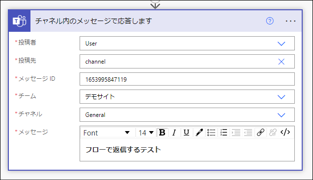「Microsoft Teams」>「チャネル内のメッセージで応答します」というアクションがあります。このアクションはチャネルのスレッドに返信を行うためのアクションのようです。