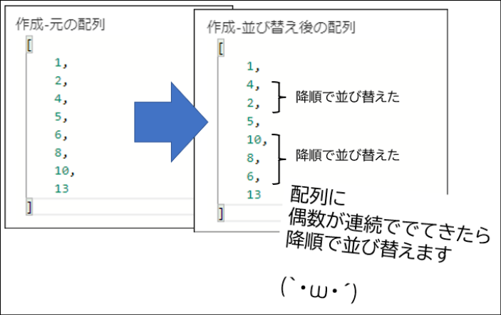 このフローのポイントは、一時的なデータの格納場所を活用することで配列内の要素の並びが特定の条件に一致しているかどうか判定しているところです。