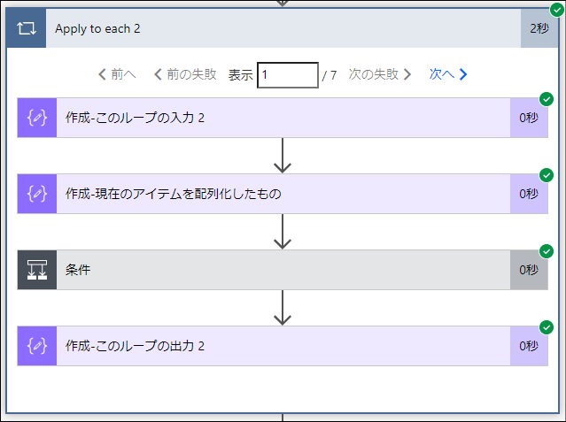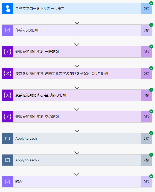 このフローでは「2つの繰り返し処理(Apply to each)」と「結合」アクションで配列の整形を実現しています。